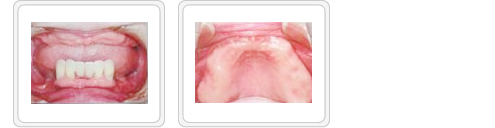 残存歯に対して支持装置付きのメタルボンドブリッジを作製し、上顎は無口蓋義歯を作製しました。臼歯部の噛み合せは総義歯に準じてリンガライズドオクルージョンにしました。
