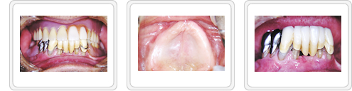 下顎の残存する歯の状態が悪くなり、それに伴い義歯も顎堤にあたって歯肉が痛むということです。上顎の前歯部の顎堤はブヨブヨしていてフラビーガムの状態でした。