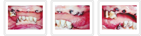 ■治療前 上顎前歯は虫歯が進行し残根状態。なるべく歯を抜かずに済むように治療計画を立てました。 |